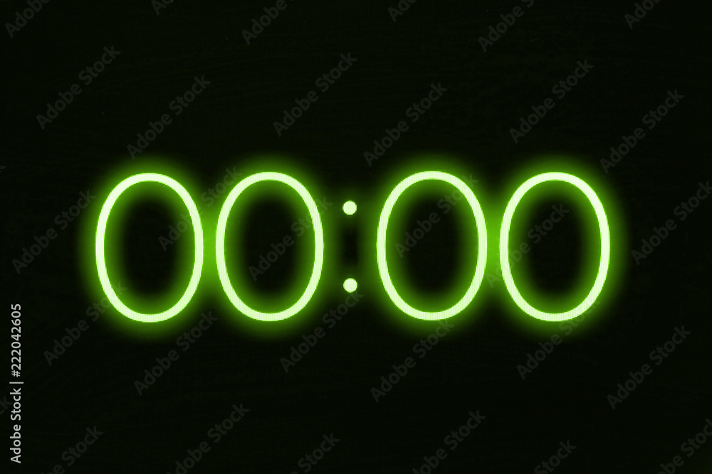 Digital clock timer stopwatch display showing 0 zero seconds remaining in glowing green numbers. Emergency, urgency, out of time concept.