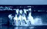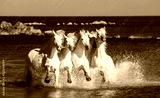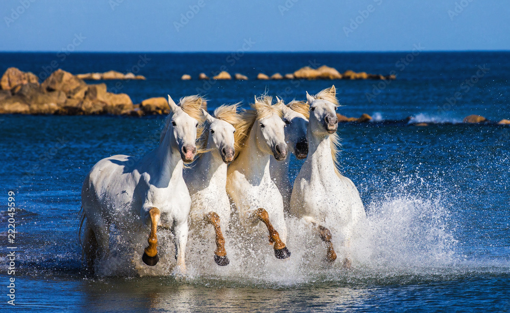 White Camargue Horses galloping along the sea beach. Parc Regional de Camargue. France. Provence.