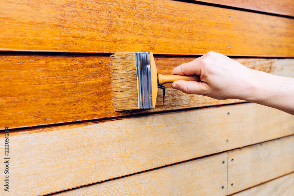 Male hand painting wooden wall with a brush