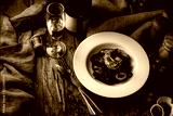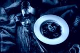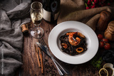 Black fettuccine spaghetti pasta with shrimp and squid topping with green parsley in white dish on woodden table with white wine and flowers, selective focus