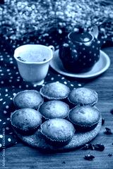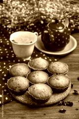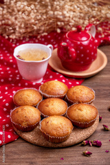 banana cup cake with a cup of tea and red tea pot on wooden table