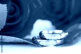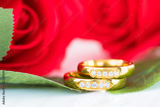Close up Gold ring and Red roses on white