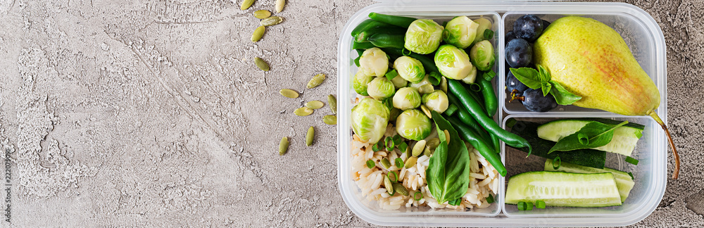 Vegan green meal prep containers with rice, green beans, brussel sprouts, cucumber and fruits. Dinner in lunch box. Banner. Top view. Flat lay