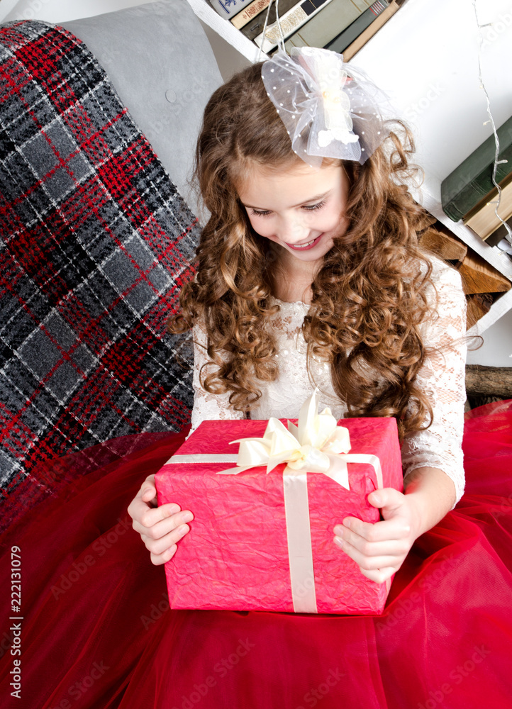 Adorable smiling little girl in princess dress holding gift box in christmas time