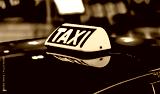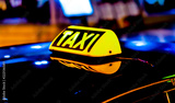 Night picture of a taxi car. Taxi sign on the car roof glowing in the dark