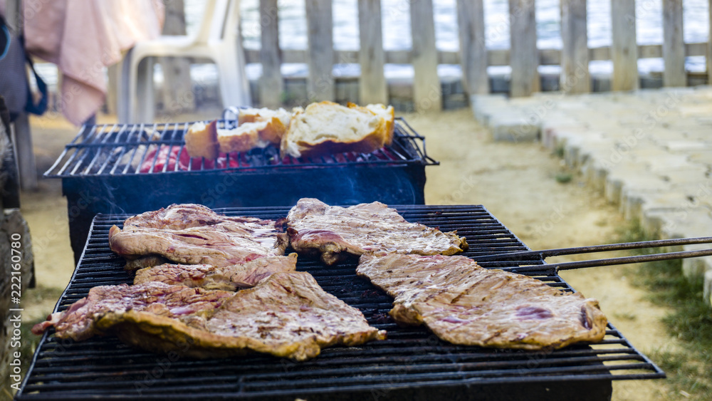 Beefs and steaks on barbecue grill with fire and smoke. Spicy marinated raw lamb / calf meat beefs and steaks cooking over the flames of a barbecue. Barbeque grate concept at delicious picnic party.