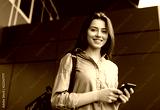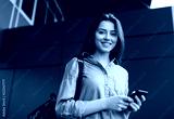 Portrait of positive and smiling university student using mobile phone for researching information online. Attractive successful woman walking on street and posing for pictures. Online education
