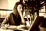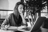 Successful freelancer typing on keyboard using laptop computer in loft office. Portrait of skilled copywriter at workplace.Smiling student learning languages at library, planning project.