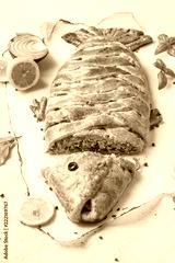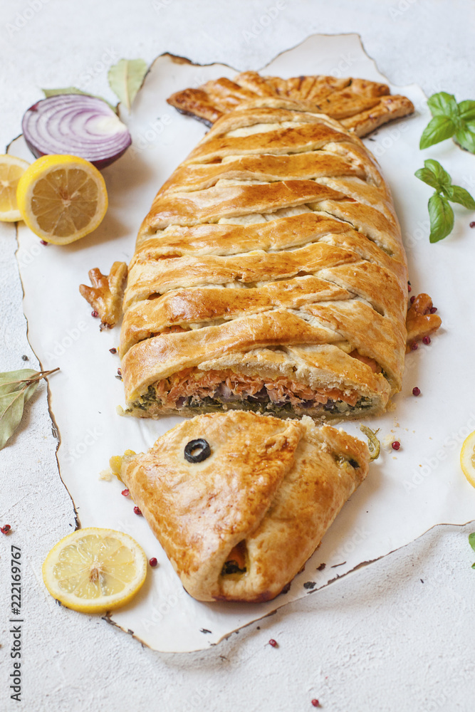 Homemade Fish Pie made from smoked salmon and spinach, and homemade dough made from white wine and olive oil.