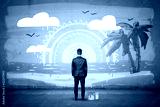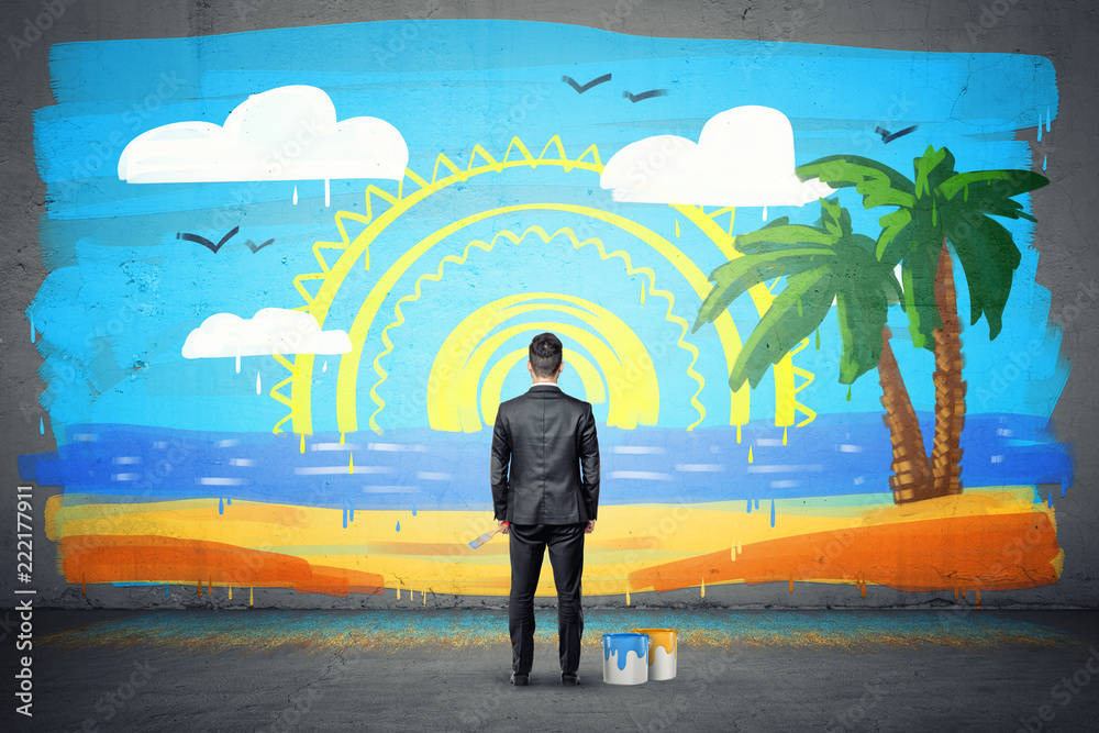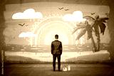 A businessman stands with his back turned and looking at a finished wall picture of exotic isle.