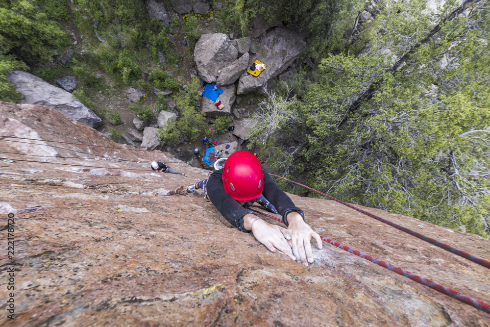 The last movements to reach the summit by a male climber. Rock climbing inside the Andes mountains at Cajon del Maipo, Chile