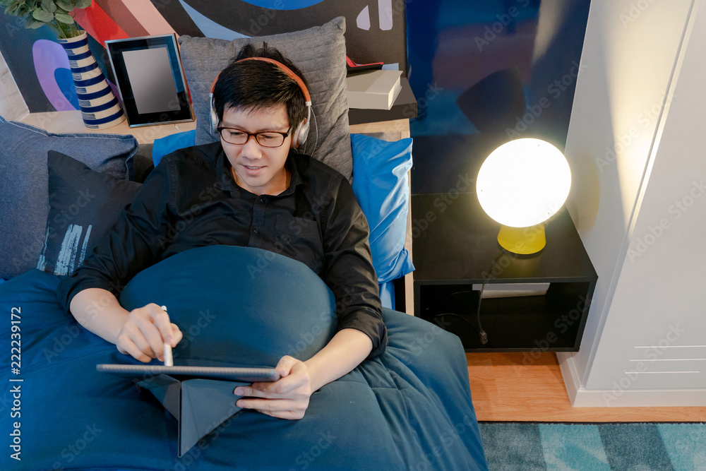 Young Asian happy man listening to music with headphones while using digital tablet and pen on his comfortable blue bed in the bedroom. Home living lifestyle with modern electronic gadgets concept