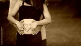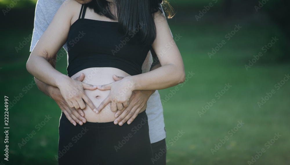 Cropped shot view of pregnancy woman in black Yoga wear forming heart shape on her belly and her husband hugging belly from the back.