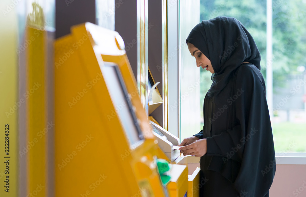Arab woman and automated teller machine . Woman withdrawing money or checking account balance.