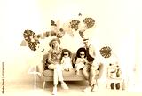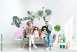 Family portrait of four. Happy parents in big hats and thier cheerful kids