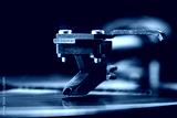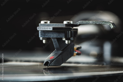Tonearm with background cartridge for vinyl records. Close-up, copy space.