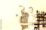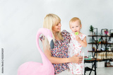 Beautiful woman and her cute little daughter at home. Baby girl with a lollipop
