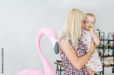 Young blond mother holds the little daughter on hands. Baby girl with a lollipop