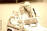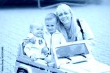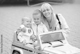 Young blonde mother with her little kids. Outdoors. Children with toy car