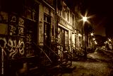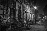 Beautiful old alley with old buildings shot in the night well illuminated by street lamps