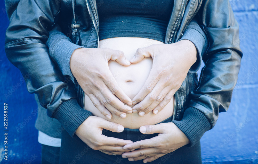 Cropped shot view of pregnancy woman in black Yoga wear, forming heart shape on her belly and her husband hugging belly from the back.