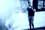 Stylish beard arabian man in glasses and black t-shirt smoking hookah outdoor. Arab model having rest.