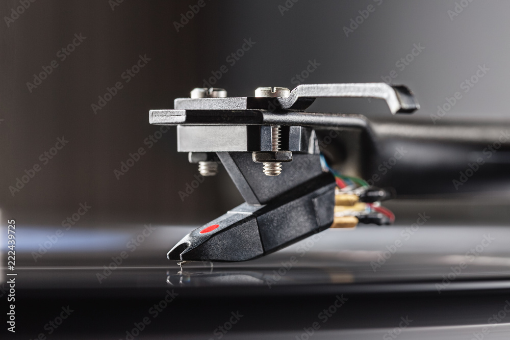 DJ turntable for vinyl records, cartridge on tonearm and space for text.