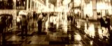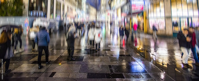 silhouette of colorful people on the rainy night street