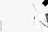 White office desk table with laptop computer, smartphone, and supplies. Top view with copy space, flat lay.