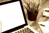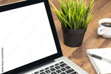 Laptop with white blank mock up screen and office supplies are on top of wood office desk table.