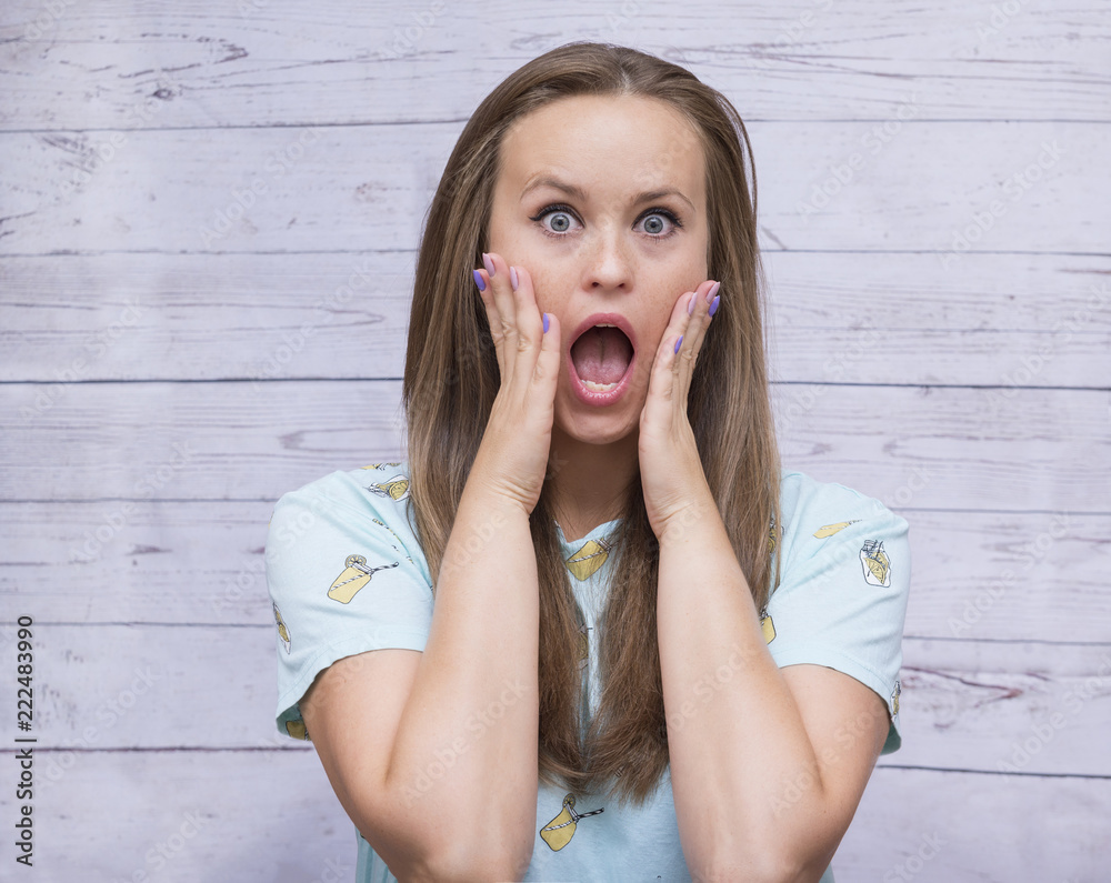 white, girl, long hair, holding hands near the face with a surprised, frightened expression