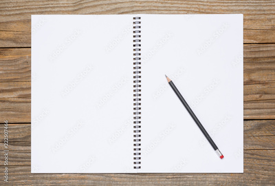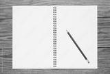 Blank page of a sketchbook with a black pencil, over old wooden texture