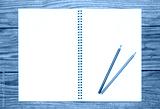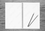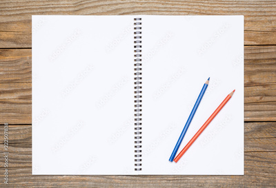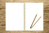 Blank page of a sketchbook with colored pencils on an old wooden table