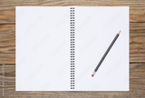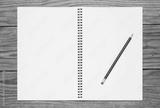Blank page of a sketchbook with a black pencil, over old wooden texture