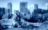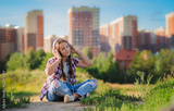 young girl listening music headphones, urban street style, outdoor street style hipster dj woman in black cap headphones dj listening to music and smiling, orange, crazy style city background, sunset