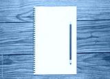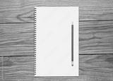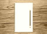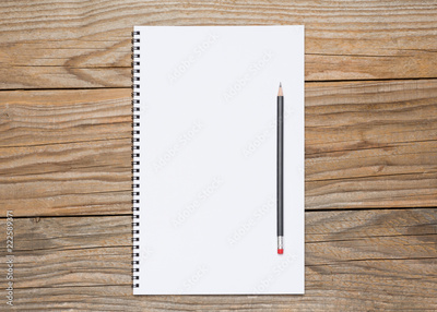 Blank page of a sketchbook with a black pencil over old wooden texture