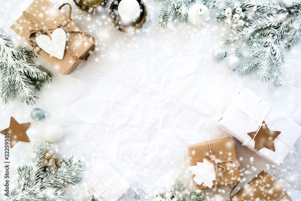 Christmas and New Year holiday background. Xmas greeting card. Christmas gifts on white background top view. Flat lay