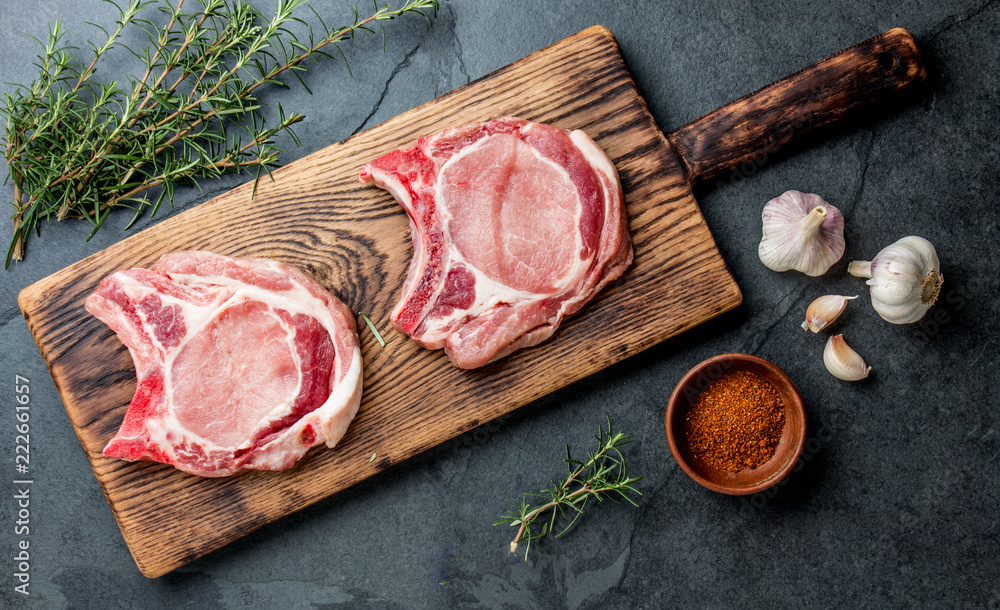 Raw pork steaks with seasoning on wooden board. Gray slate background
