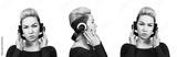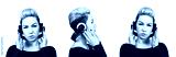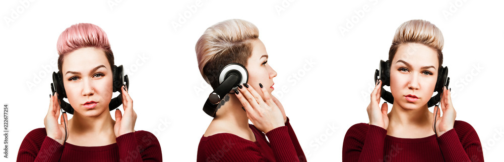 Set of young beautiful girl listening to music on headphones isolated on a white background.