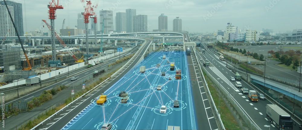 iot smart automotive Driverless car with artificial intelligence combine with deep learning technology. self driving car can situational awareness around the car, letting it navigate itself 360 degree