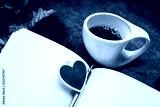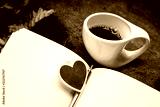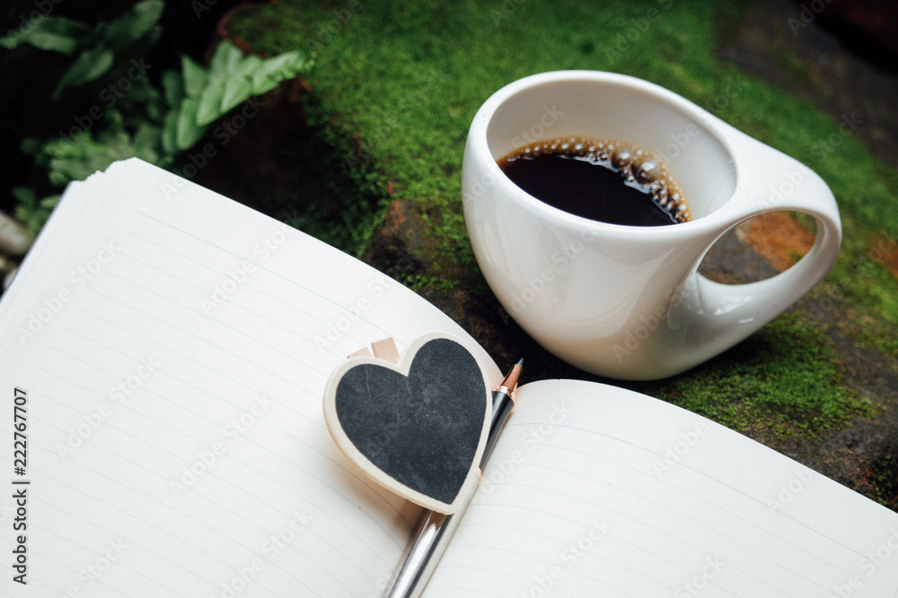 A cup of coffee in a lichen rock garden.