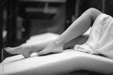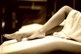 My lower body. Close up of female legs with perfect skin. Woman relaxing on daybed at spa lounge