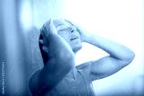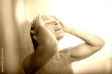Relief and relaxation. Portrait of attractive wet lady with closed eyes and opened mouth standing under water drops