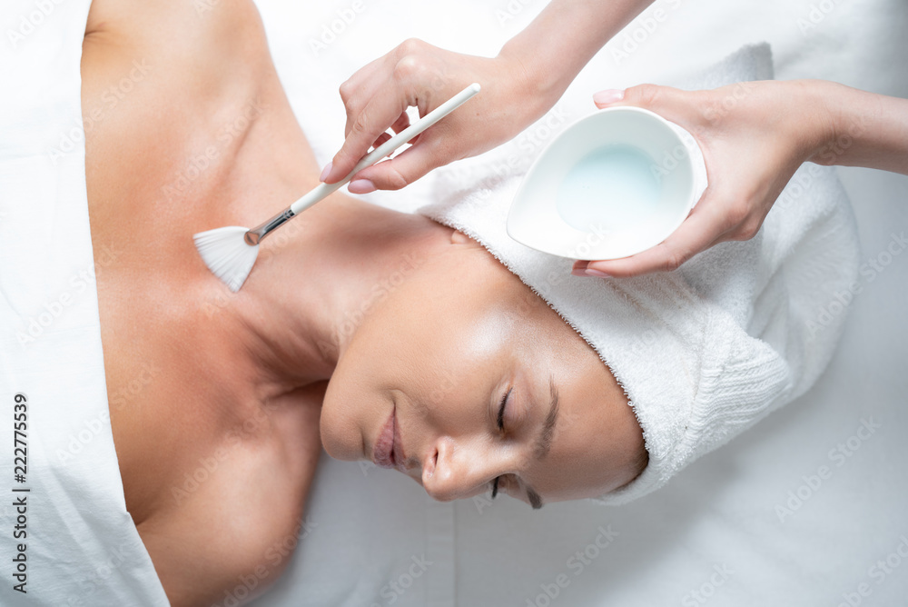 Cozy place. Top view close up portrait of charming middle aged woman with towel on head enjoying skincare procedure. She is lying with closed eyes and smiling