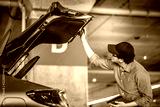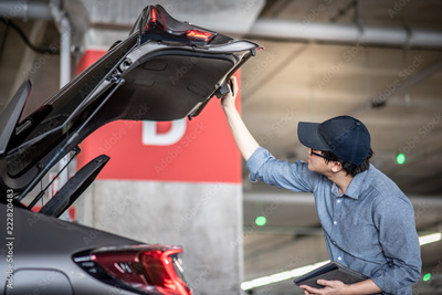 Young Asian auto mechanic holding digital tablet checking tailgate in auto service garage. Mechanical maintenance engineer working in automotive industry. Automobile servicing and repair concept
