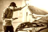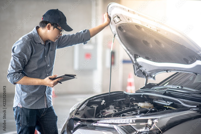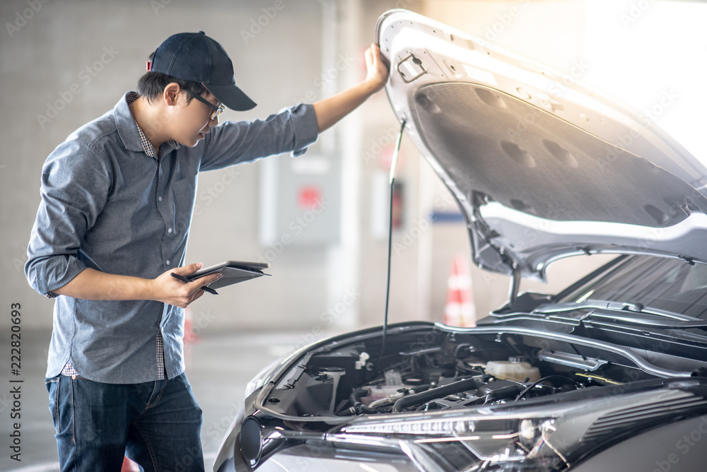 Asian auto mechanic holding digital tablet checking car engine under the hood in auto service garage. Mechanical maintenance engineer working in automotive industry. Automobile servicing and repair