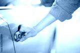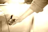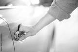 Close up of male hand holding and opening the metallic car door handle. Urban lifestyle with automobile concept