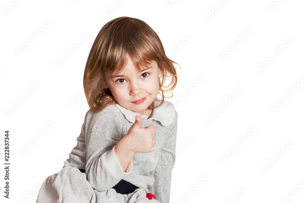 Portrait of little baby girl showing thumb up isolated on a white background.