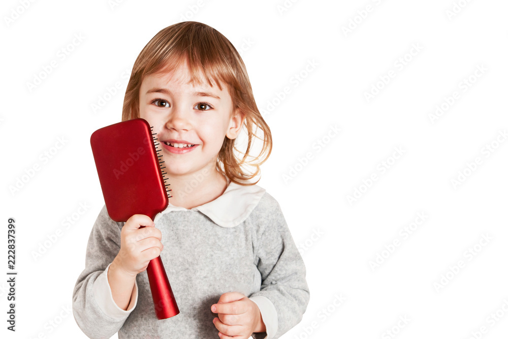 Portrait of smiling little baby girl holding comb isolated on a white background.
