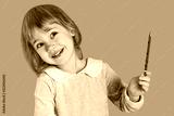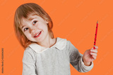 Portrait of little baby girl holding pencil isolated on an orange background.